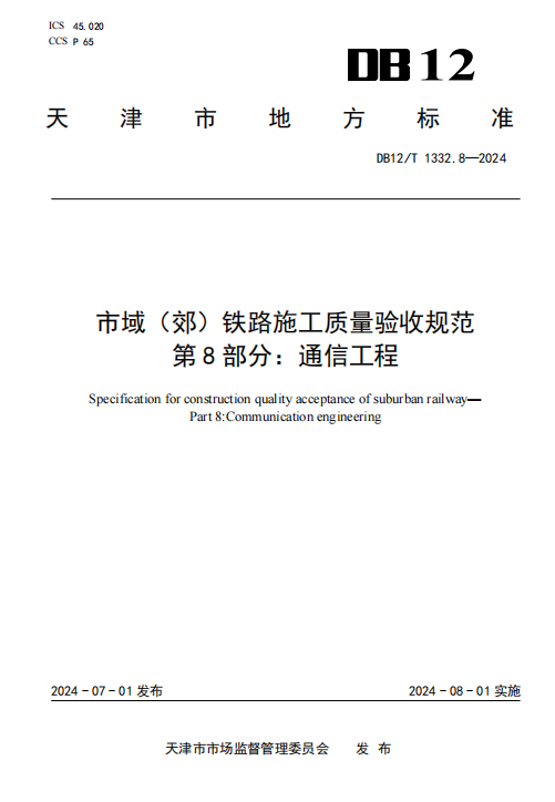 DB12/T 1332.8-2024《天津市域(郊)铁路施工质量验收规范第8部分:通信工程》