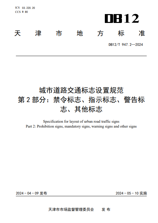 DB12/T 947.2-2024 城市道路交通标志设置规范第2部分:禁令标志、指示标志、警告标志、其他标志