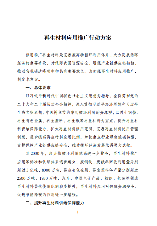 《再生材料应用推广行动方案》