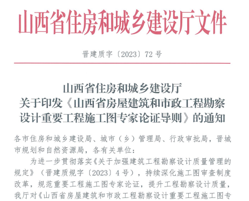 晋建质字(2023)72号 山西省房屋建筑和市政工程勘察设计重要工程施工图专家论证导则