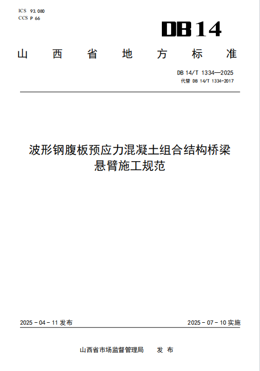 DB14/T 1334-2025 波形钢腹板预应力混凝土组合结构桥梁悬臂施工规范