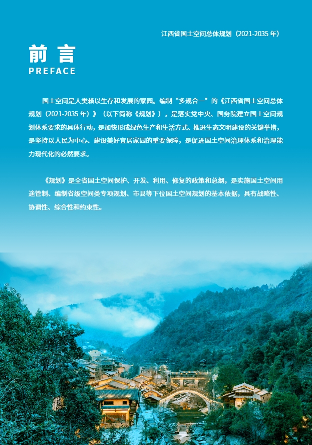 国士空间是人类赖以生存和发展的家园。编制“多规合一”的《江西省国士空间总体规划(2021-2035年)》(以下简称《规划》),是落实党中央、国务院建立国土空间规划体系要求的具体行动,是加快形成绿色生产和生活方式、推进生态文明建设的关键举措是坚持以人民为中心、建设美好宜居家园的重要保障,是促进国士空间治理体系和治理能力现代化的必然要求。