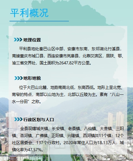 平利位于陕西东南部、陕鄂渝三省市交界处,国土面积2647平方公里,辖11镇137个村6个城市社区,总人口23万,女娲文化的重要发源地。