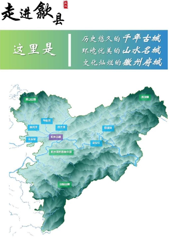 歙县北倚黄山,东临杭州,南连千岛湖,面积2122平方公里,辖28个乡镇,182个行政村、10个社区,人口46.89万。1986年被国务院命名为国家历史文化名城,与山西平遥、云南丽江、四川阆中并称为我国保存最完好的四大古城