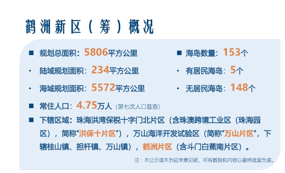 鹤洲新区规划范围为鹤洲新区陆域范围,总面积约235平方公里,含鹤洲、洪湾保税十字门、万山三个片区。规划海域范围初步包括原万山、横琴海域。
