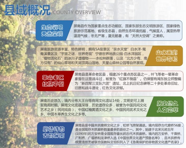 屏南县位于福建省东北部,县域面积1487平方公里,辖5镇6乡8个社区,总人口20.53万,是全国农村改革试验区、全国传统村落集中连片保护利用示范县、中国传统村落文化创意产业发展示范县、中国民间文化艺术之乡、中国民间药膳示范县、国家东部生态文明旅游区、省重点侨乡。