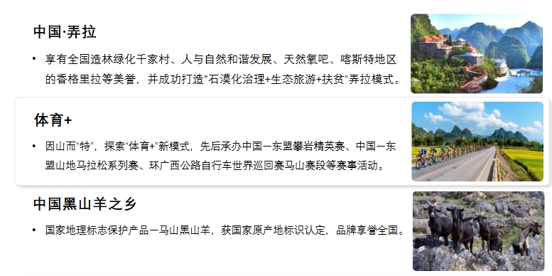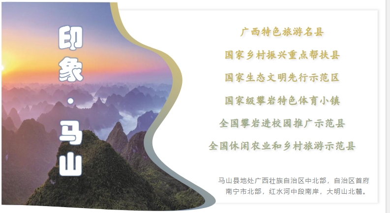 马山县,隶属广西壮族自治区南宁市,地处广西壮族自治区中北部,南宁市北部,红水河中段南岸,大明山北麓。总面积2340.76平方千米。辖7个镇、4个乡。