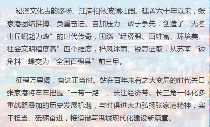张家港市位于长江经济带和21世纪海上丝绸之路交汇处,以境内天然良港——张家港港而命名。市域总面积999平方公里,其中陆域面积777平方公里,下辖10个区镇,3个街道,拥有2个国家级开发区,1个省级高新区,1个省级冶金产业工业园,总人口167万,其中户籍人口93万。