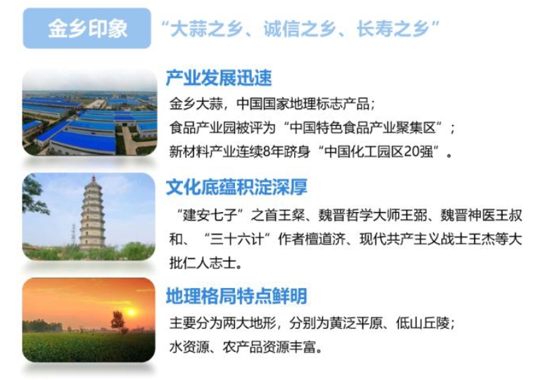 金乡位于山东省西南部,隶属“孔孟之乡、运河之都”济宁市,全县辖9个镇、4个街道、1个省级开发区,总面积886平方公里,人口63.5万,是驰名中外的大蒜之乡、诚信之乡、长寿之乡。