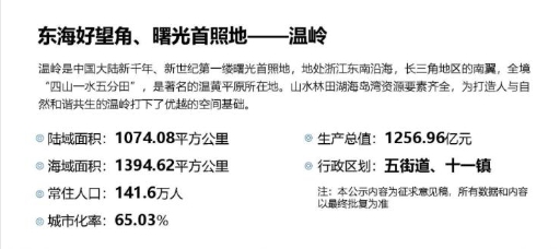 温岭市,是中国大陆新千年、新世纪第一缕曙光首照地,地处浙江东南沿海。温岭市域总面积2005平方千米,温岭辖5个街道、11个镇,常住人口142.3万。