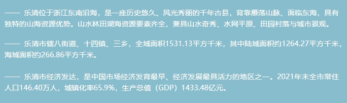 乐清市,位于温州市北翼,陆地面积1174平方千米,海域面积270平方千米,海岸线长193.3千米。乐清市辖8个街道、14个镇、3个乡,常住人口为146.72万人。