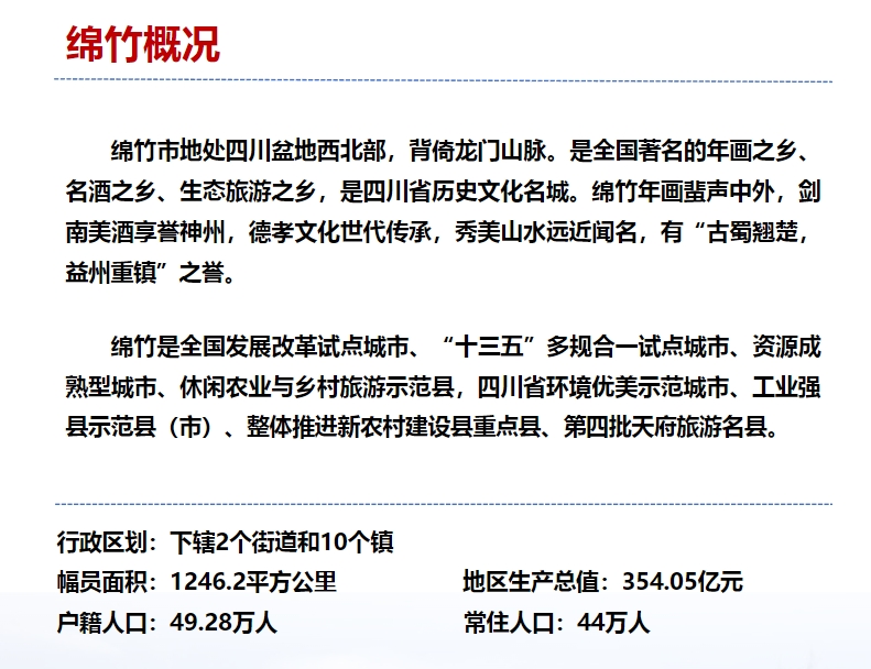 绵竹地处四川盆地西北部,背倚龙门山脉,幅员面积1246.2平方公里,市境东南靠德阳市旌阳区,东北与绵阳市安州区接壤,西南与什邡市隔河相望,西北与阿坝州茂县毗连。绵竹素有“洞天福地、人杰地灵”的美誉,人口48.6万,辖10个镇、2个街道,153个村(社区),是全国著名的年画之乡、名酒之乡、生态旅游之乡、民间艺术之乡。