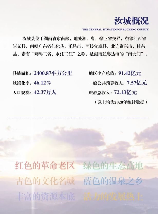 汝城县,隶属湖南省郴州市,位于湖南省东南部,地处湘、粤、赣三省交界,素有“鸡鸣三省,水注三江”之称,是湖南通粤达海的“南大门”。