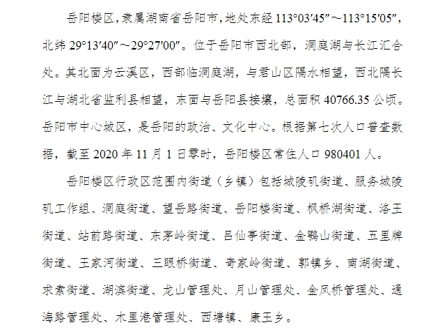 岳阳楼区,隶属湖南省岳阳市。位于洞庭湖之滨,湖南省东北部,总面积103.7平方公里,是岳阳市的政治、经济、文化中心。截至2022年,岳阳楼区区划调整后,辖1个乡14个街道办事处,8个村、100个社区,常住人口63.93万人。