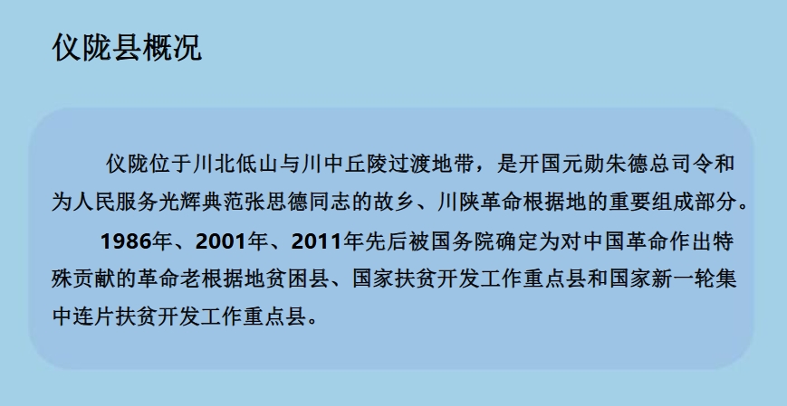 仪陇位于川北低山与川中丘陵过渡地带,是开国元勋朱德总司令和为人民服务光辉典范张思德同志的故乡、川陕革命根据地的重要组成部分。全县幅员面积1791平方公里,辖37个乡镇(街道)、531个村(居),总人口106.29万,其中农业人口83.15万,现有耕地64314公顷。