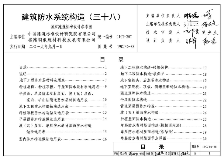 本图集以福建铜浪建材科技发展有限公司的防水材料在建筑屋面、地下室、室内及其他地下工程中的防水构造做法和应用技术为依据编制的。包括说明、防水材料适用部位选用表、防水层材料选用表、防水构造做法选用表、节点详图等。