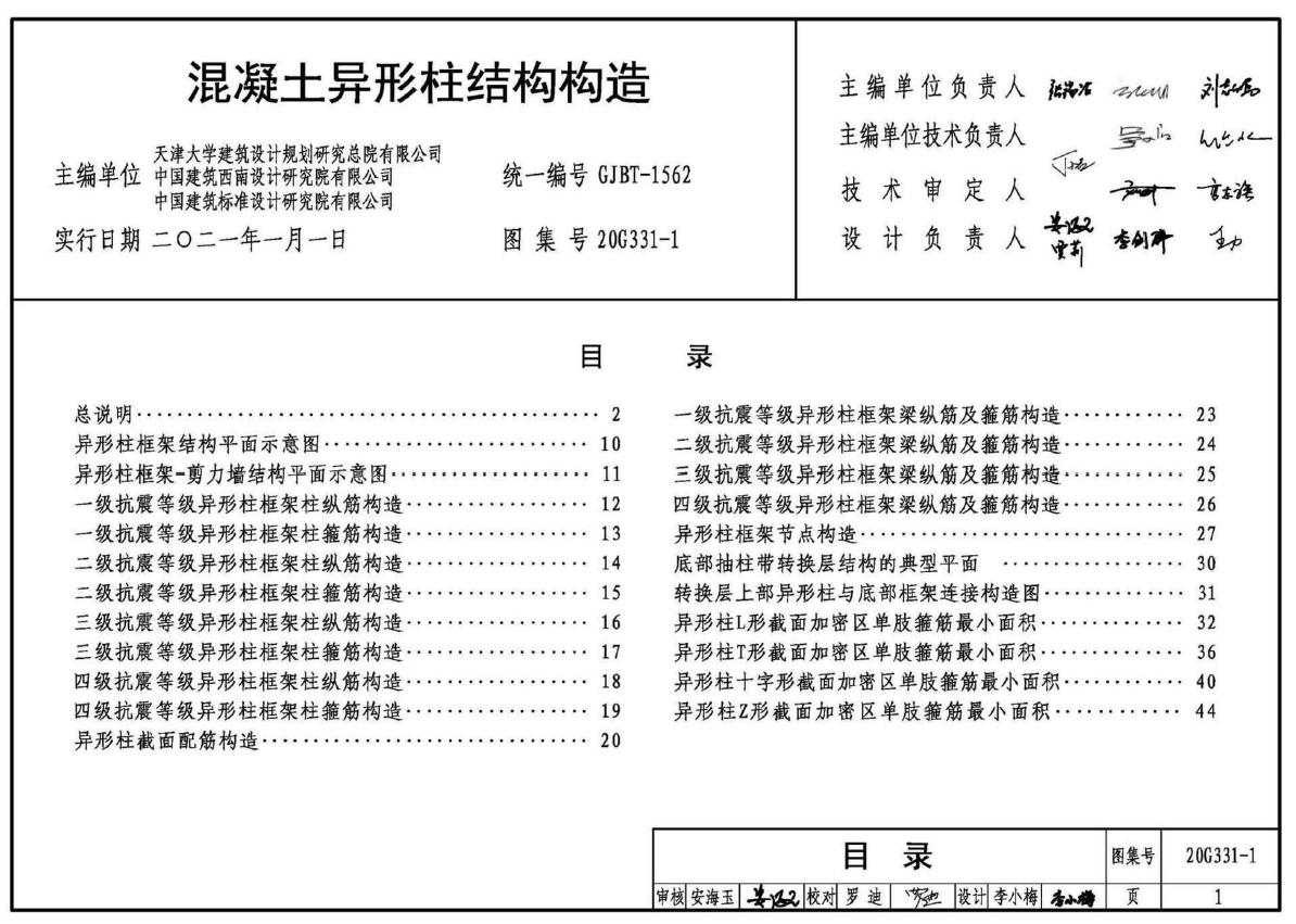 本图集适用于抗震设防烈度为6~8度地区的一般居住建筑混凝土异形柱结构的设计与施工。主要内容包括混凝土异形柱结构基本设计规定、施工注意事项:混凝土异形柱框架柱配筋构造,、异形柱框架梁配筋构造、异形柱框架节点构造、底部抽柱带转换层的异形柱结构构造和异形柱常用截面加密区单肢箍筋最小面积。