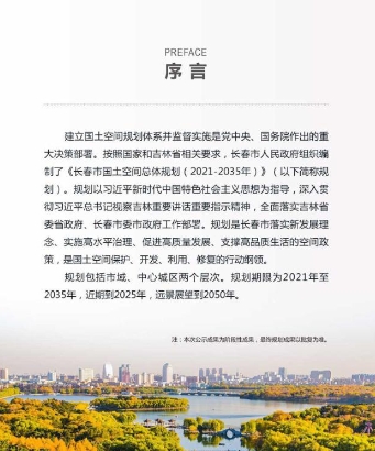建立国土空间规划体系并监督实施是党中央、国务院作出的重大决策部署。按照国家和吉林省相关要求,长春市人民政府组织编制了《长春市国土空间总体规划(2021-2035年)》(以下简称规划)。规划以习近平新时代中国特色社会主义思想为指导,深入贯彻习近平总书记视察吉林重要讲话重要指示精神,全面落实吉林省委省政府、长春市委市政府工作部署。规划是长春市落实新发展理念、实施高水平治理、促进高质量发展、支撑高品质生活的空间政策,是国土空间保护、开发、利用、修复的行动纲领.