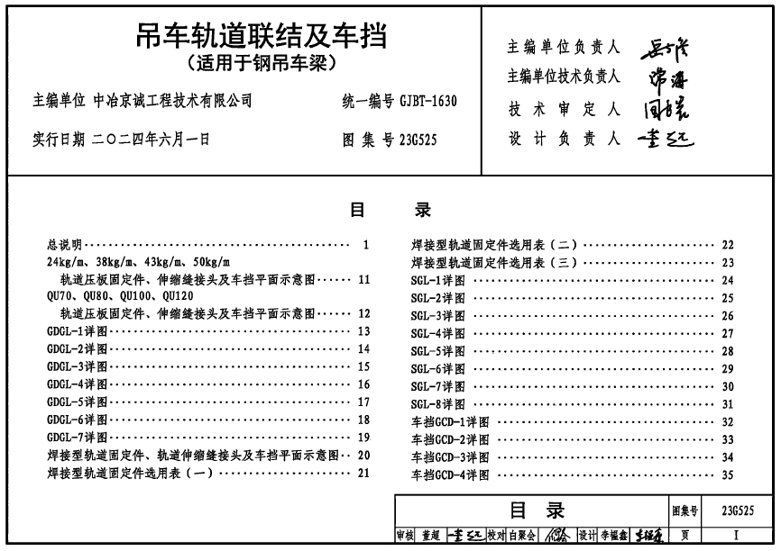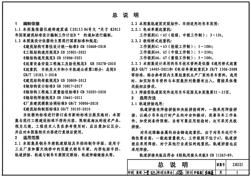 本图集是钢吊车梁轨道联结及车挡的制作详图,适用于工业厂房和露天栈桥中的实腹式钢吊车梁。内容包括车挡、轨道拼接、轨道与钢吊车梁固定联结、轨道伸缩绛接头等。