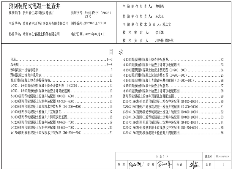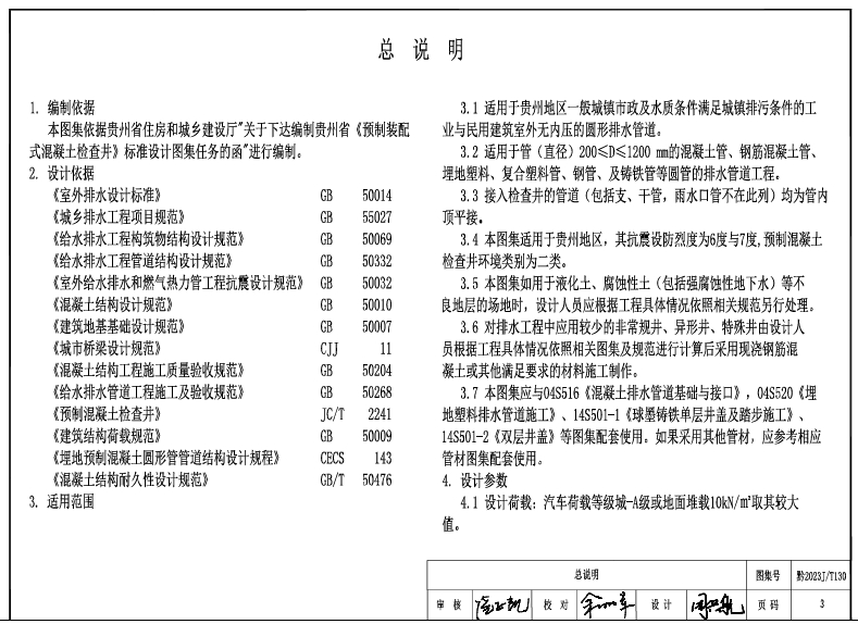 黔2023J/T130 预制装配式混凝土检查井,应与04S516《混凝土排水管道基础与接口》,04S520《埋地塑料排水管道施工》、14S501-1《球墨铸铁单层井盖及踏步施工》、14S501-2《双层井盖》等图集配套使用。
