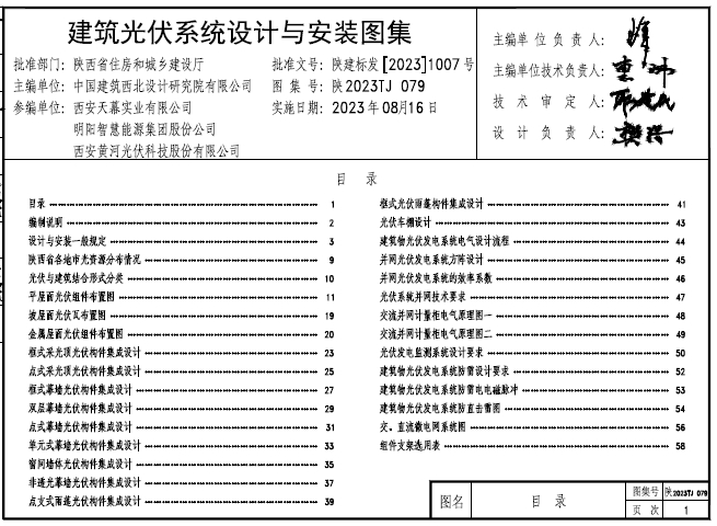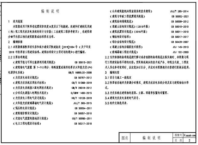 陕2023TJ 079 建筑光伏系统设计与安装图集,适用于陕西省抗震设防烈度8度及以下的新建。改建和扩建的民用建(构)筑工程光伏发电系统的设计与安装(工业建筑工程参考使用),各建筑部分细节内容以相关建筑图集或标准要求为准。