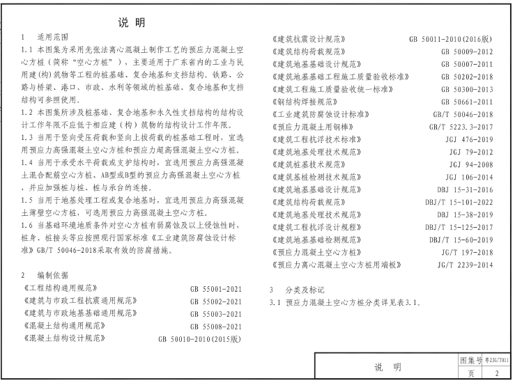 粤23GT011 预应力混凝土空心方桩,为采用先张法离心混凝土制作工艺的预应力混凝土空心方桩(简称“空心方桩”),主要适用于广东省内的工业与民用建(构)筑物等工程的桩基础、复合地基和支挡结构。铁路、公路与桥梁、港口、市政、水利等领域的桩基础、复合地基和支挡结构可参照使用。