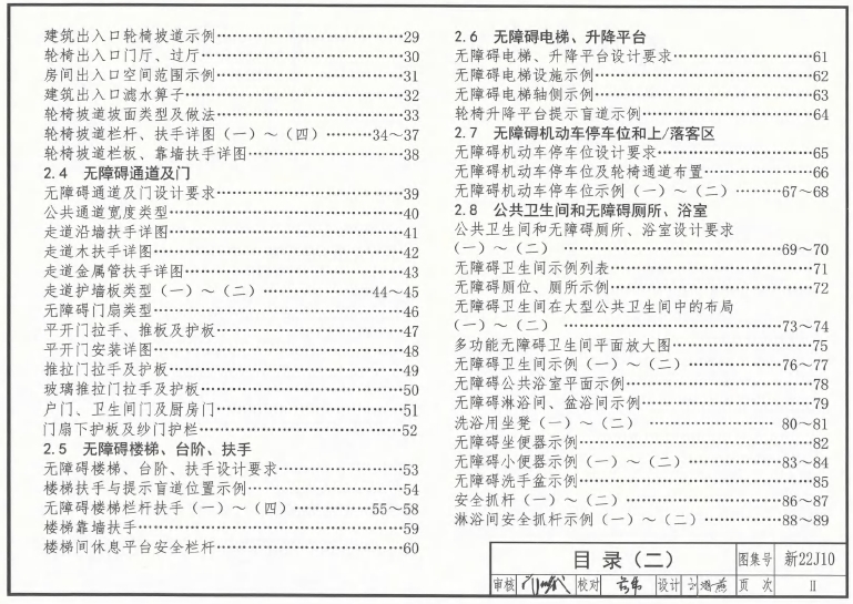 新22J10 无障碍设计,适用于自治区范围内新建、改建和扩建的公共建筑、居住建筑、居住区以及城市道路、广场、绿地、停车场等城市市政工程的无障碍系统化设计,包括无障碍通行设施、无障碍服务设施、无障碍标识、无障碍基本参数和无障碍设计技术措施要求及常用的建筑构造做法,供使用者选用和参考。