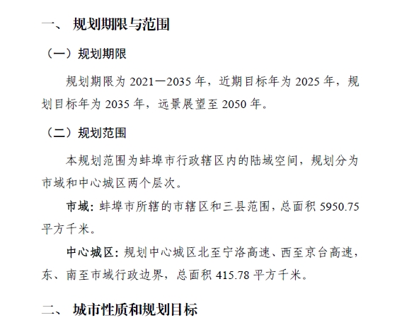 蚌埠市国土空间总体规划(2021—2035年),国土空间开发保护格局稳定,基本建成安全、绿色、开放、协调、宜居、智慧和富有竞争力的美丽国士,[国家级综合交通枢纽链接能力更强,淮河生态经济带中心城市和皖北地区中心城市地位更加突出,全面建成宜居宜业宜游的现代化美好蚌埠