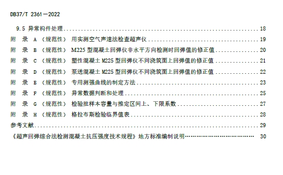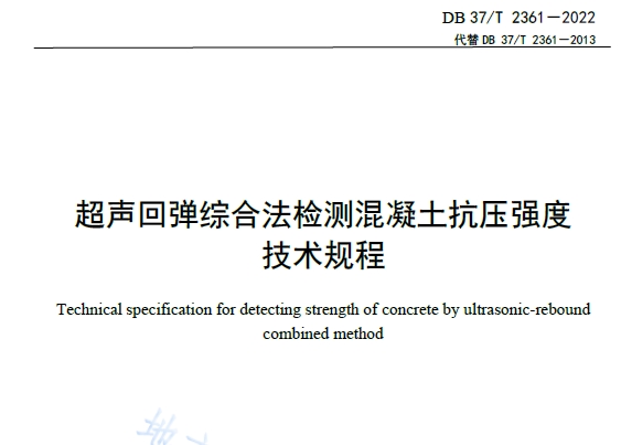 DB 37/T 2361-2022 超声回弹综合法检测混凝土抗压强度技术规程适用于采用超声回弹综合法进行建筑结构中普通混凝土抗压强度的检测。不适用于因冻害、化学侵蚀、火灾、高温等已造成表面疏松、剥落的混凝土抗压强度的检测。
