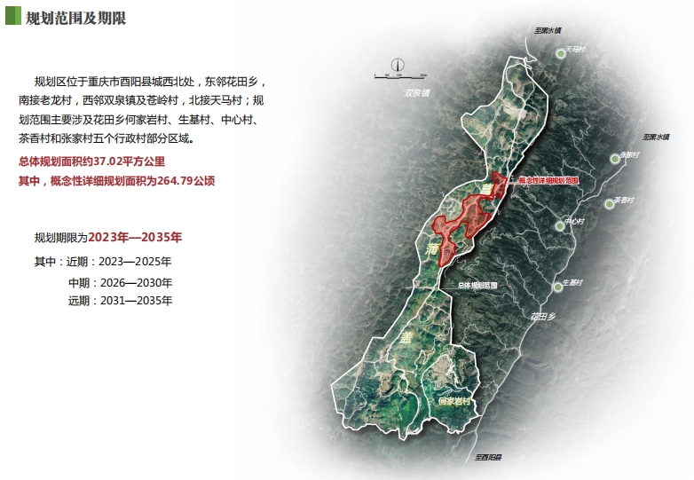 规划区位于重庆市酉阳县城西北处,东邻花田乡南接老龙村,西邻双泉镇及苍岭村,北接天马村;规划范围主要涉及花田乡何家岩村、生基村、中心村、茶香村和张家村五个行政村部分区域。总体规划面积约37.02平方公里其中,概念性详细规划面积为264.79公顷。