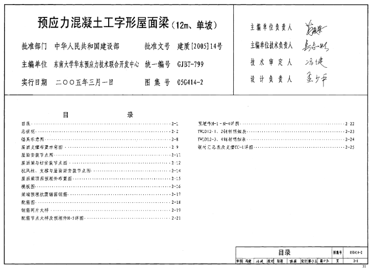 本图集为12m跨度后张预应力混凝土工字形单坡屋面梁的标准图(以下简称屋面梁),图集编号05G414-2。