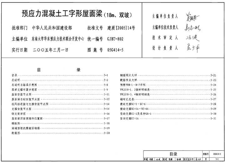 本图集为18m跨度后张预应力混凝土工字形双坡屋面梁的标准图(以下简称屋面梁),图集编号05G414-5。