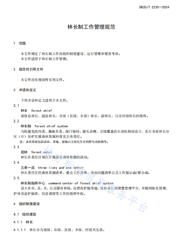 DB35_T+2235-2024+林长制工作管理规范,本文件规定了林长制工作的组织制度建设、运行管理和督查考核。本文件适用于林长制工作管理。