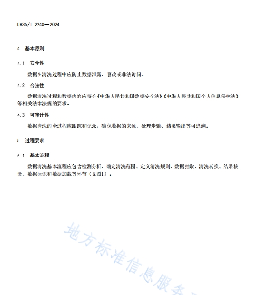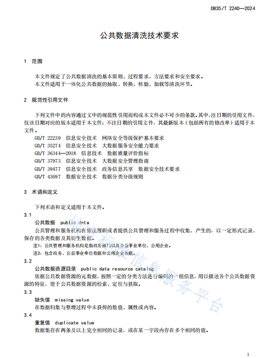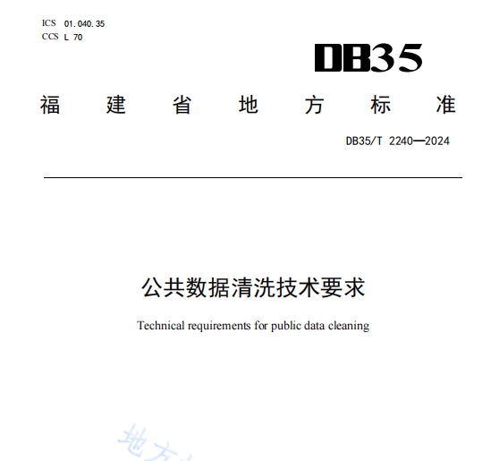 DB35_T+2240-2024+公共数据清洗技术要求,本文件规定了公共数据清洗的基本原则、过程要求、方法要求和安全要求。本文件适用于一体化公共数据的抽取、转换、核验、加载等清洗环节。