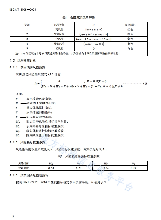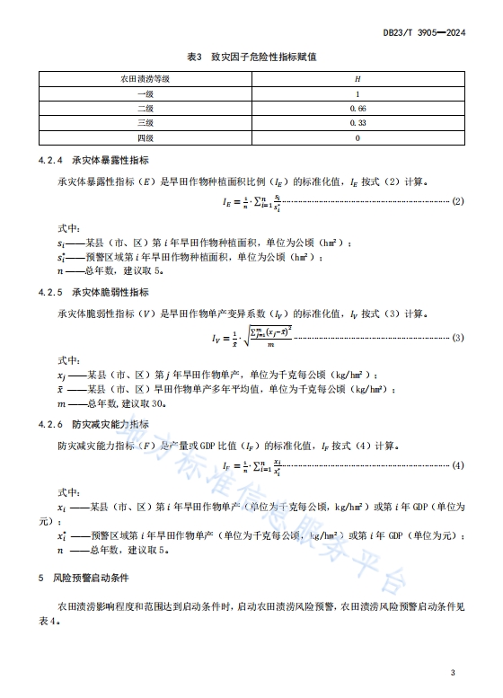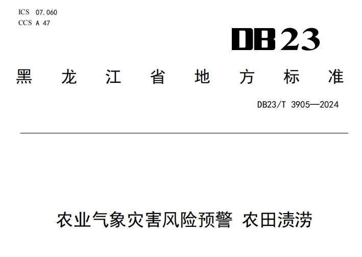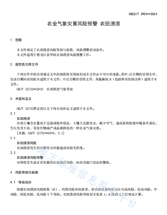 DB23T 3905—2024农业气象灾害风险预警+农田渍涝,本文件规定了农田渍涝风险等级与指数、风险预警启动条件。适用于黑龙江省早田农田渍涝风险预警工作。