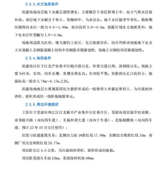 钢结构厂房总承包施工组织设计,拟建场区位于江北产业集中区皖兴路以北、和谐大道以西,深圳路以东。场地主要为村舍、农田,间有水塘、鱼塘及排水沟。农田较平整。依勘探孔孔口高程计,地面标高一般在 5.78m~8.17m 之间。