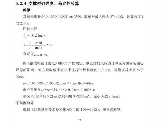 【特大桥】基坑支护(钢板桩)设计和计算书,使用9m拉森I钢板桩对基坑进行封闭支护,钢围设于承台顶标高以上1.509m,钢板桩顶往下1m处,围采用H400x400x13x21mm 型钢,围长边下方设置不少于3个牛腿,上方采用直径8m钢丝绳兜吊在拉伸钢板桩上,斜角撑采用H400X400x13x21mm 型钢,斜撑两端与围型钢焊接牢固。基坑尺寸控制原则为自承台外轮廓外扩1.2m,为保证承台模板与钢筋的顺利施工,围斜角撑的位置应避免阻碍模板与钢筋的吊装施工。