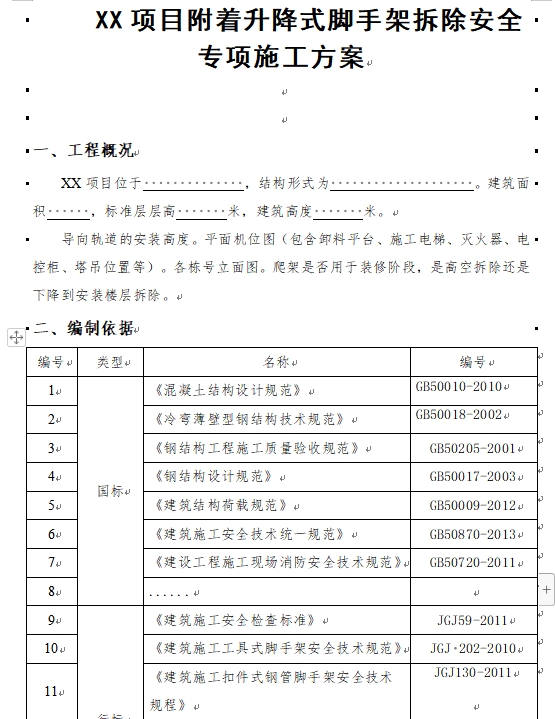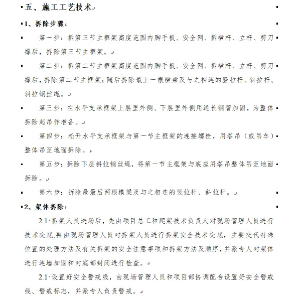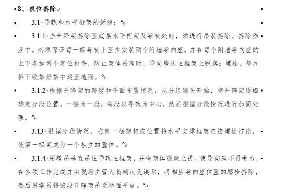附着升降式脚手架拆除安全专项施工方案,拆架人员进场后,先由项目总工和爬架技术负责人对现场管理人员进行技术交底,再由现场管理人员对拆架人员进行拆架安全技术交底,主要交代特殊位置的处理方法及有关拆架的安全注意事项和拆架方法及顺序,并派专人对架体进行连墙加固和对底部封闭进行检查。