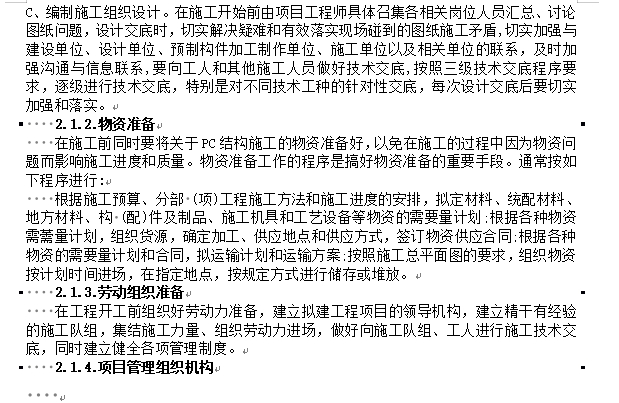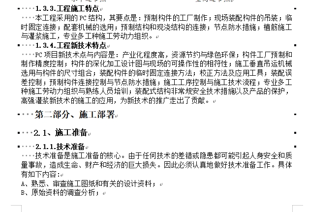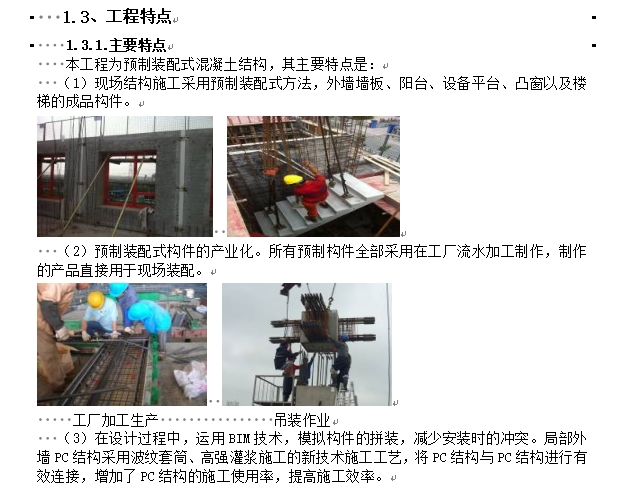 预制装配式混凝土结构安装专项施工方案,本工程采用的 PC结构,其要点是:预制构件的工厂制作;现场装配构件的吊装;临时固定连接;配套机械的选用;预制结构和现浇结构的连接;节点防水措施;筋施工与灌浆施工,专业多工种施工劳动力组织。