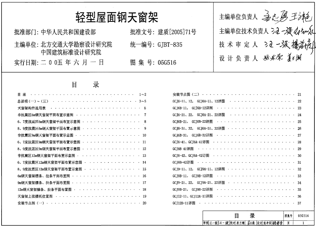 本图集为6m、9m和12m跨度的轻屋面天架(以下简称天架)及相应的支撑施工详图。本图集屋面材料为压型钢板、夹芯板和发泡水泥复合板(太空板),分有体系和无檀体系,屋面坡度为1/10,适用于天窗架间距为6m的单层工业厂房。