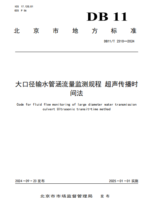 DB11/T 2310-2024 大口径输水管涵流量监测规程 超声传播时间法
