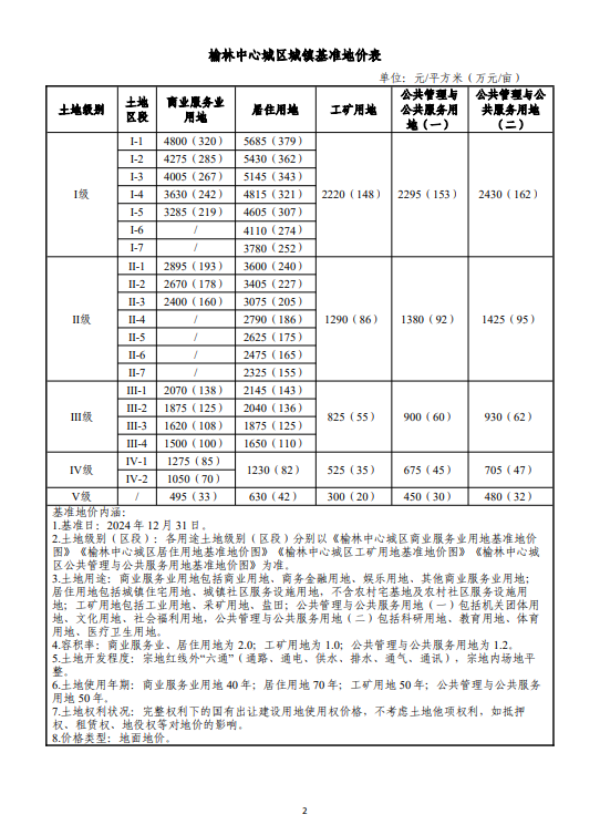 榆林中心城区城镇基准地价表