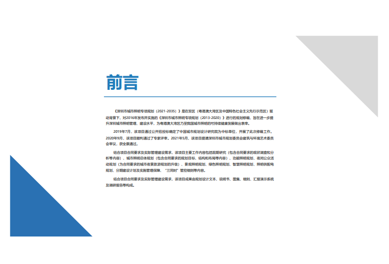 《深圳市城市照明专项规划(2021-2035)》是在双区(粤港澳大湾区及中国特色社会主义先行示范区)驱动背景下,对2016年发布并实施的《深圳市城市照明专项规划(2013-2020)》进行的规划修编,旨在进一步提升深圳城市照明管理、建设水平,为粤港澳大湾区乃至我国城市照明的可持续健康发展做出表率。