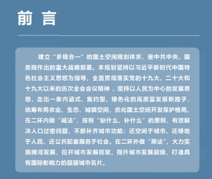 建立“多规合一”的国土空间规划体系,是中共中央、国务院作出的重大战略部署。本规划坚持以习近平新时代中国特色社会主义思想为指导,全面贯彻落实党的十九大、二十大和十九大以来的历次全会会议精神,坚持以人民为中心的发展思想,走出一条内涵式、集约型、绿色化的高质量发展新路子统筹布局农业、生态、城镇空间,优化国土空间开发保护格局在二环内做“减法”,按照“缺什么、补什么”的原则,有效解决人口过密问题,不断补齐城市功能:还空间于城市、还绿地于人民、还公共配套服务于社会。在二环外做“乘法”,大力实施拥河发展,拉开城市发展框架,提升城市发展能级,打造具有国际影响力的靓丽城市名片。