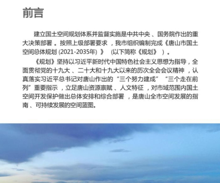 建立国土空间规划体系并监督实施是中共中央、国务院作出的重大决策部署。按照上级部署要求,我市组织编制完成《唐山市国土空间总体规划(2021-2035年)》(以下简称《规划》),《规划》坚持以习近平新时代中国特色社会主义思想为指导,全面贯彻党的十九大、二十大和十九大以来的历次全会会议精神,认真落实习近平总书记对唐山作出的“三个努力建成”“三个走在前列”重要指示,立足唐山资源禀赋、人文特征,对市域范围内国士空间开发保护做出总体安排和综合部署,是唐山全市空间发展的指南、可持续发展的空间蓝图。