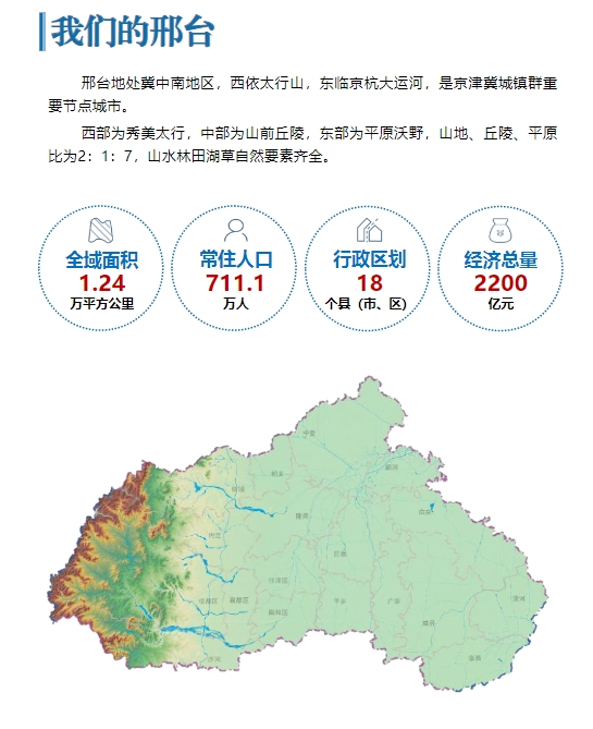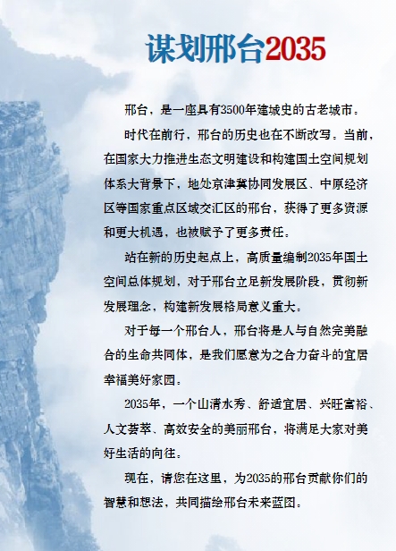 邢台是一座具有3500年建城史的古老城市。时代在前行邢台的历史也在不断改写。当前在国家大力推进生态文明建设和构建国土空间规划体系大背景下地处京津冀协同发展区、中原经济区等国家重点区域交汇区的邢台获得了更多资源和更大机遇也被赋予了更多责任。