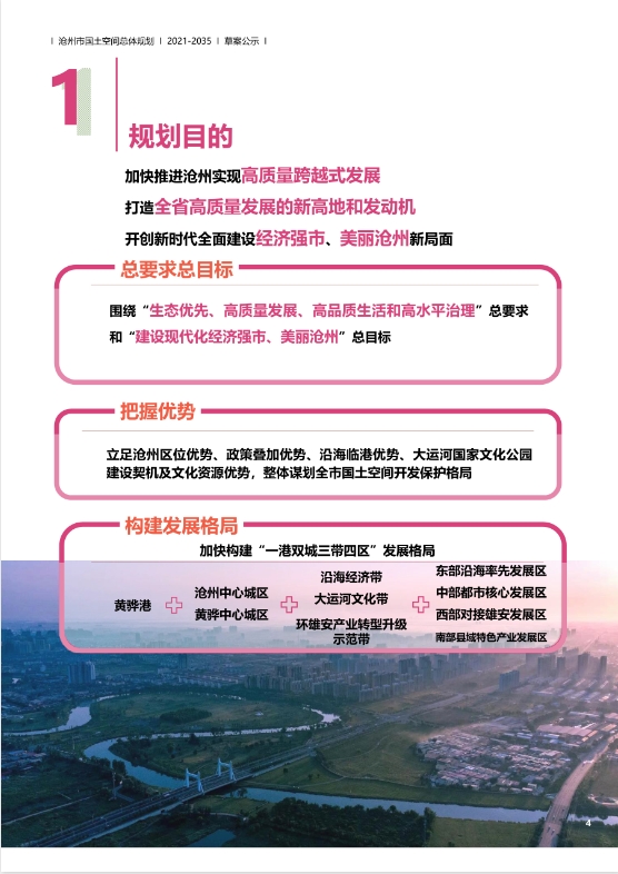 规划目的,加快推进沧州实现高质量跨越式发展打造全省高质量发展的新高地和发动机开创新时代全面建设经济强市、美丽沧州新局面.总要求总目标,围绕“生态优先、高质量发展、高品质生活和高水平治理”总要求和“建设现代化经济强市、美丽沧州”总目标.