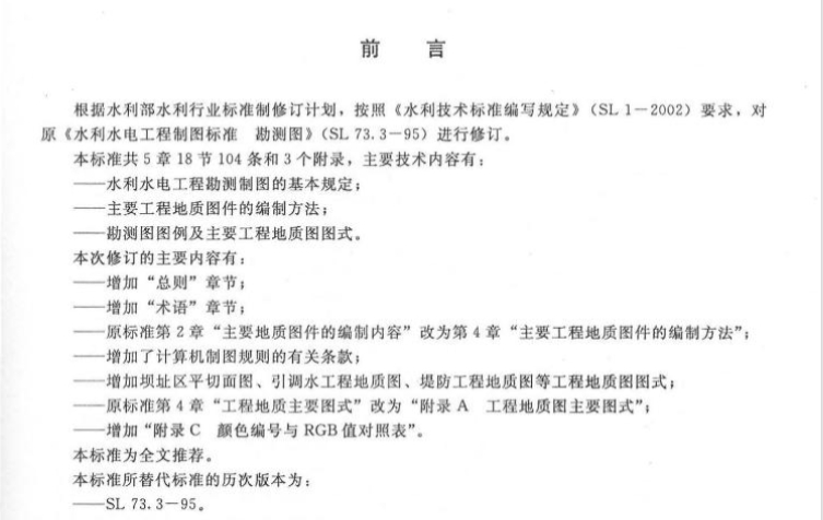 【SL73.3-2013】水利水电工程制图标准勘测图1.0.1为规范水利水电工程勘测制图工作,保证制图质量,提高制图效率,编制本标准。1.0.2本标准适用于水利水电工程地质图件的绘制。1.0.3本标准的引用标准主要有以下标准:《地质图用色标准比例尺1:500000~1:100000))(GB6390)《水利水电工程地质勘察规范》(GB50487)《中小型水利水电工程地质勘察规范》(SL55)《水利水电工程制图标准基础制图》(SL73.1)《堤防工程地质勘察规程)》(SL188)《水利水电工程天然建筑材料勘察规程》(SL25])《水利水电工程地质测绘规程》(SL299)《水利水电工程施工地质勘察规程》(SL313)《水利水电工程地质勘察资料整编规程》(SL567)1.0.4水利水电工程勘测制图除应符合本标准的规定外,尚应符合国家现行有关标准的规定。
