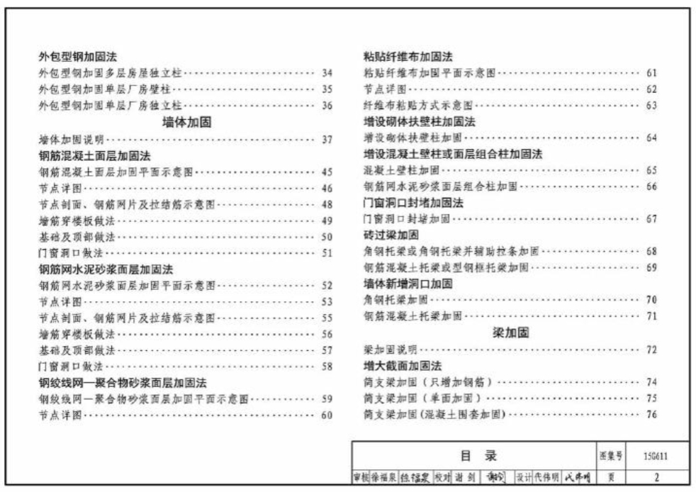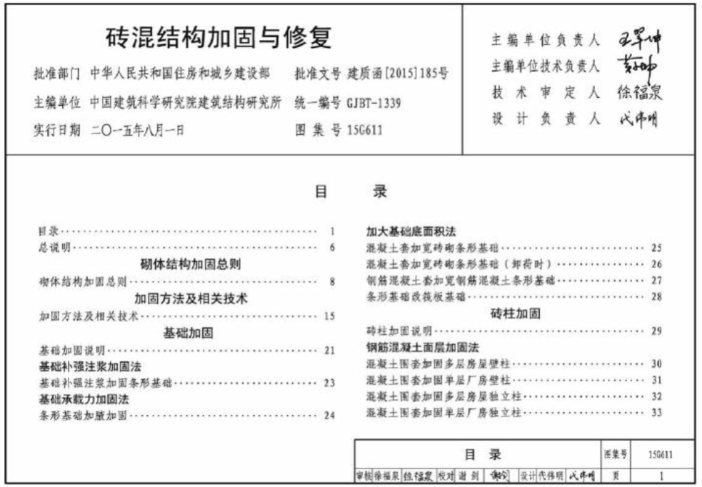 本图集包括砌体结构加固总则、加固方法及相关技术、基础加固、砖柱加固、墙体加固、梁加固、板加固、房屋整体性加固、楼梯加固、墙体托换拆除加固、悬挑阳台加固、出屋面小房间加固、出屋顶烟囱加固、砖烟囱加固、砖筒壁水塔加固。