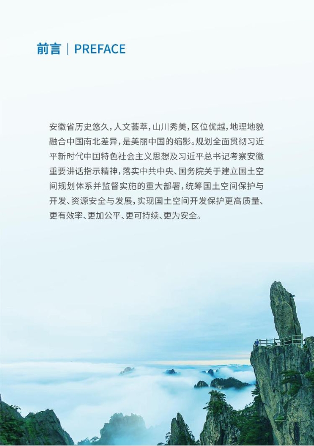 安徽省历史悠久,人文荟萃,山川秀美,区位优越,地理地貌融合中国南北差异,是美丽中国的缩影。规划全面贯彻习近平新时代中国特色社会主义思想及习近平总书记考察安徽重要讲话指示精神,落实中共中央、国务院关于建立国土空间规划体系并监督实施的重大部署,统筹国土空间保护与开发、资源安全与发展,实现国土空间开发保护更高质量、更有效率、更加公平、更可持续、更为安全.